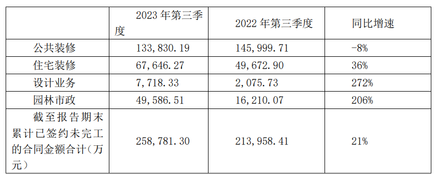 2023年,建艺集团大单不断,颇有逆境反转之势。截止至2023年第三季度末,公司累计已签约未完工的合同金额25.88亿元,同比增长21%。