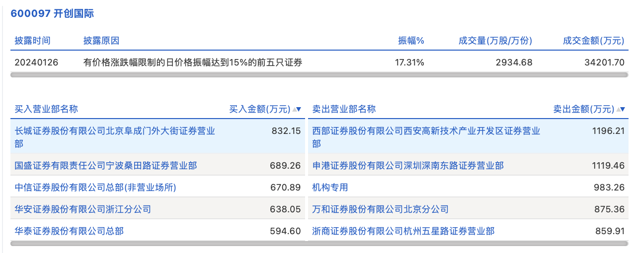1月26日,开创国际今日跌3.16%,龙虎榜数据显示,上榜营业部席位全天成交8459.16万元,占当日总成交金额比例为24.73%。其中,买入金额为3424.95万元,卖出金额为5034.21万元,合计净卖出1609.25万元。