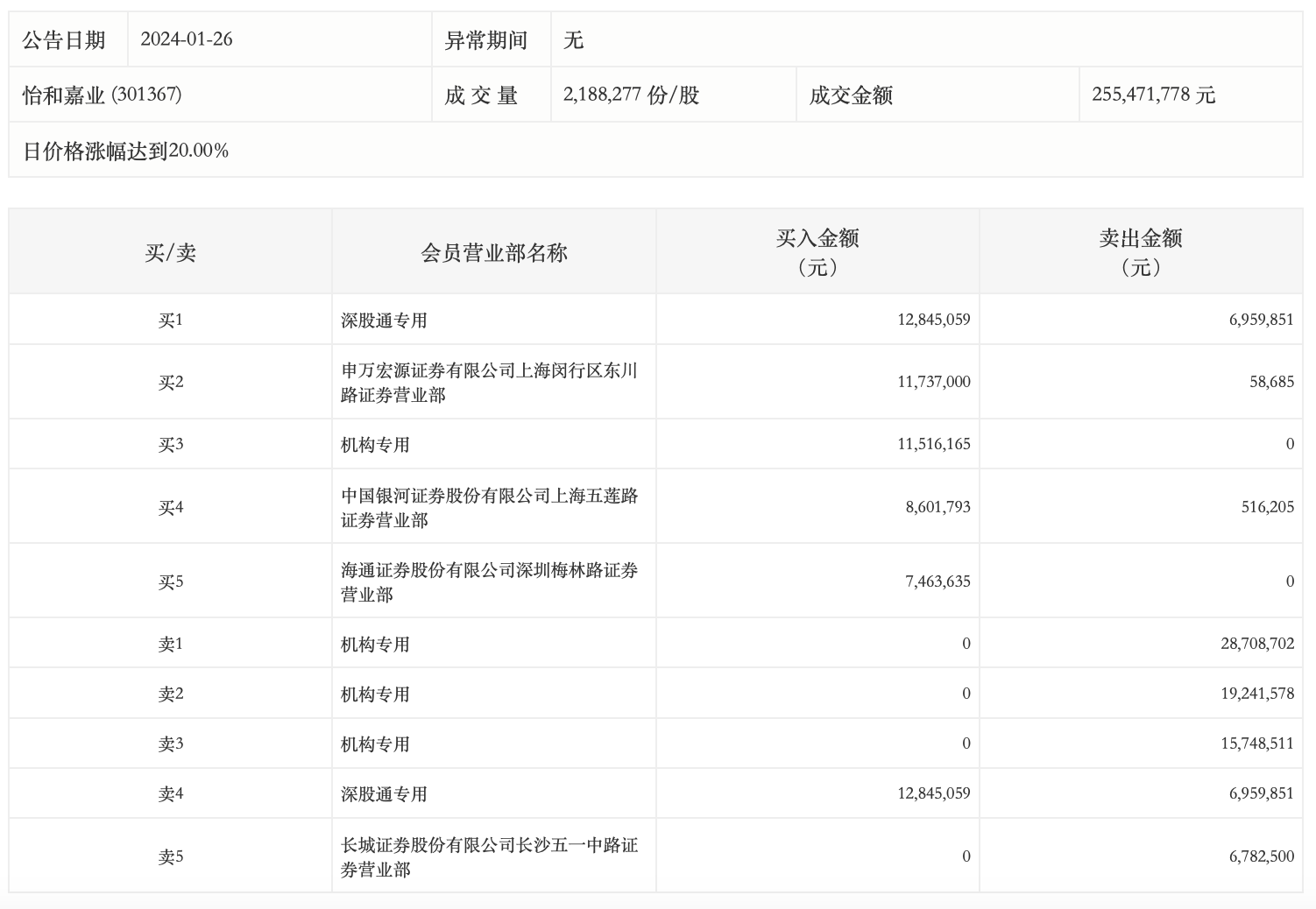 1月26日,怡和嘉业今日涨停,全天换手率达5.39%,振幅达7.54%。龙虎榜数据显示,营业部席位合计净卖出2585.24万元。其中,机构买入1151.62万元,卖出6369.88万元,合计净卖出5218.26万元。此外,深股通专用、申万宏源证券有限公司上海闵行区东川路证券营业部分别买入1284.51万元、1173.70万元;深股通专用、长城证券长沙五一中路证券营业部分别卖出695.99万元、678.25万元。