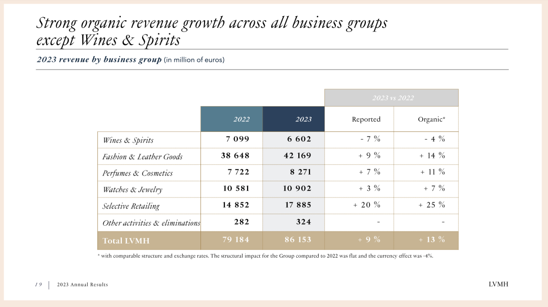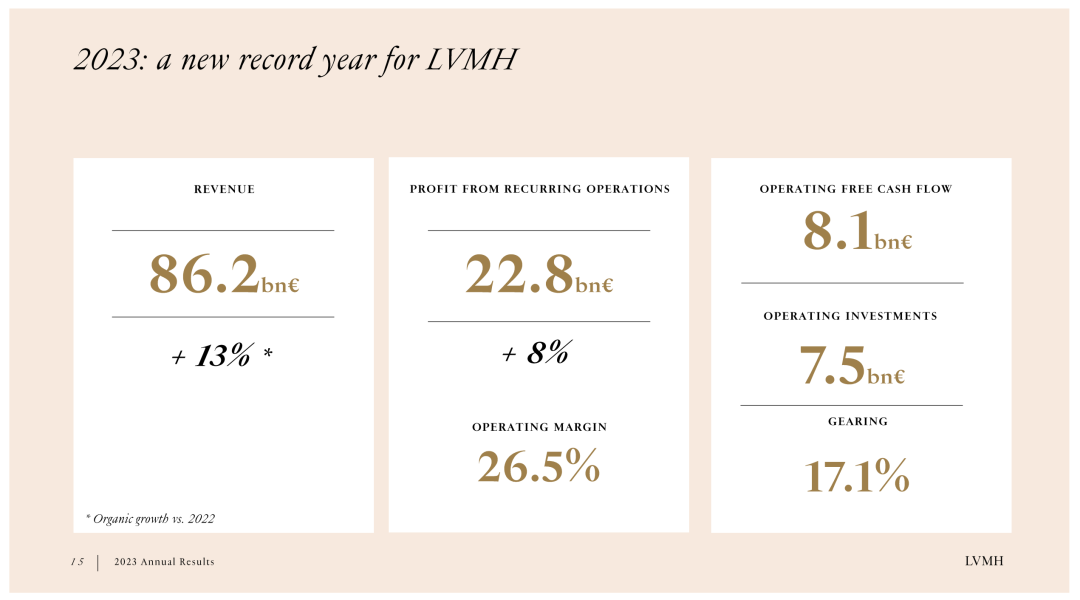 根据财报显示,2023年全年,这家全球最大奢侈品集团的营收同比增长9%达到862亿欧元,全年持续经营业务利润同比增长8%至228亿欧元,净利润同比增长8%至152亿欧元。