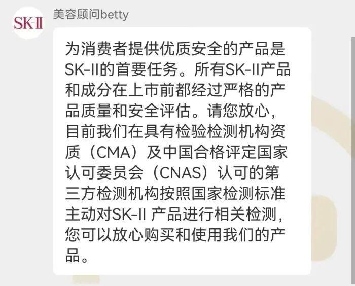 SK-II品牌客服表示,所有SK-II产品和成分在上市前都经过严格的产品质量和安全评估。“目前我们在具有检验检测机构资质(CMA)及中国合格评定国家认可委员会(CNAS)认可的第三方检测机构,按照国家检测标准主动对SK-II 产品进行了相关检测,可以放心购买和使用我们的产品。”