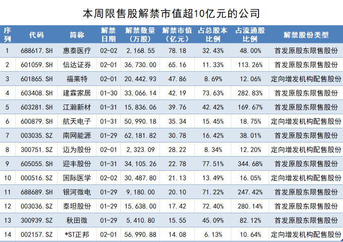 惠泰医疗是本周限售股解禁规模最大的公司。根据公告,公司2月2日有2168.55万股首发限售股解禁,占总股本比例的32.43%,约合解禁市值78.18亿元。