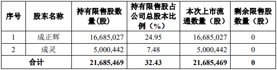 此次解禁股东共两名,为公司实控人成正辉、成灵二人。解禁筹码集中,解禁压力有限。