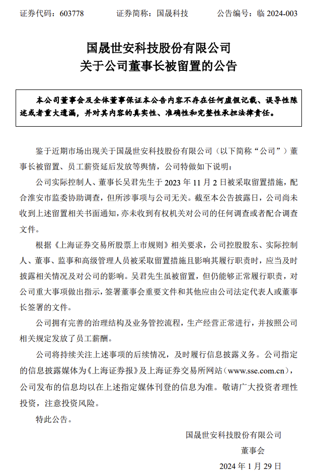 国晟科技1月28日晚间公告,公司实际控制人、董事长吴君于2023年11月2日被采取留置措施,配合淮安市监委协助调查,但所涉事项与公司无关。截至本公告披露日,公司尚未收到上述留置相关书面通知,亦未收到有权机关对公司的任何调查或者配合调查文件。吴君虽被留置,但仍能够正常履行职责,对公司重大事项做出指示,签署董事会重要文件和其他应由公司法定代表人或董事长签署的文件。公司拥有完善的治理结构及业务管控流程,生产经营正常进行,并按照公司相关规定发放了员工薪酬。
