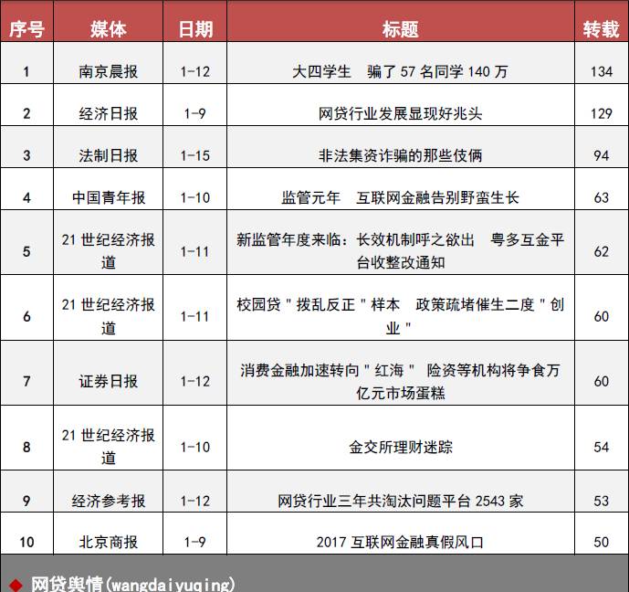 上周网贷行业的10条热点新闻,主要涉及校园网贷、专项整治、行业洗牌、非法集资、消费金融、金交所等话题。