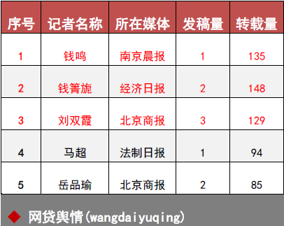 上周,北京商报记者刘双霞涉P2P发稿量较多,南京晨报记者钱鸣的稿件转载量领先于其他入榜记者。