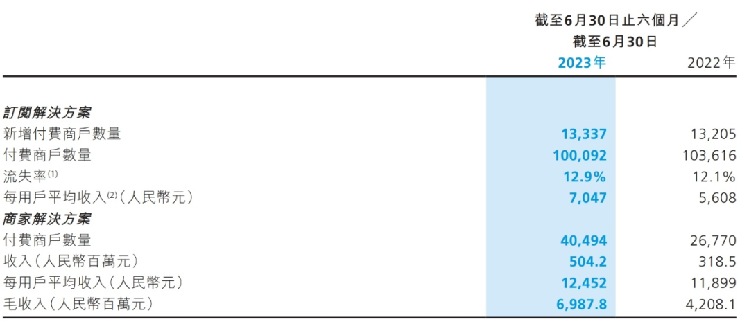 与中小企业相比,大企业的付费能力、意愿都更强,客单价、续签率也更高。这或许也是为什么2023年上半年,微盟在SaaS方案付费商户数量同比略有下降的情况下,平均每户的收益却同比增长了26%,该部分业务的毛利率也有所增长。
