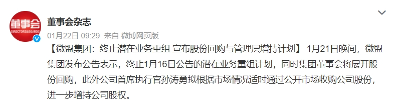 1月16日,微盟一度计划以不低于36亿元的整体估值,出售旗下负责境内营销业务的微盟传媒50%以上股权。然而出售资产计划公布后,微盟股价却大幅跳水,3个交易日跌了16.07%;于是微盟在5天后紧急终止了该计划,随后创始人连续出手增持。
