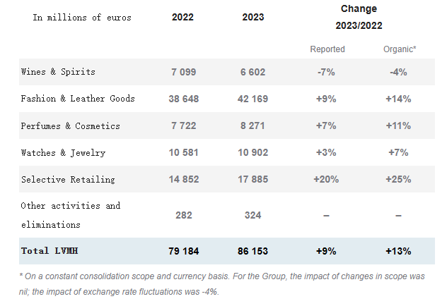 就不同部门业绩情况来看,除葡萄酒等酒类业务以外,LVMH其他主要业务2023年的有机营收均强劲增长。该酒类业务全年收入同比下跌7%至66亿欧元,有机收入下跌4%,营业利润减少2%至21亿欧元。