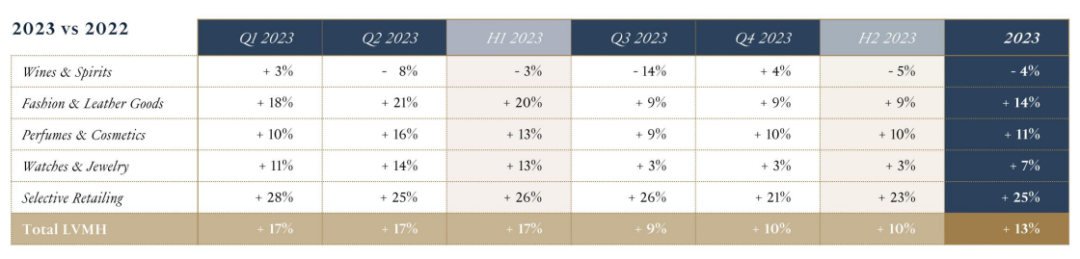 至此,2023年LVMH全年仅有三季度营收逊于预期,一季度和二季度的营收均增长17%,三季度9%的增速几乎只有前两个季度的一半。