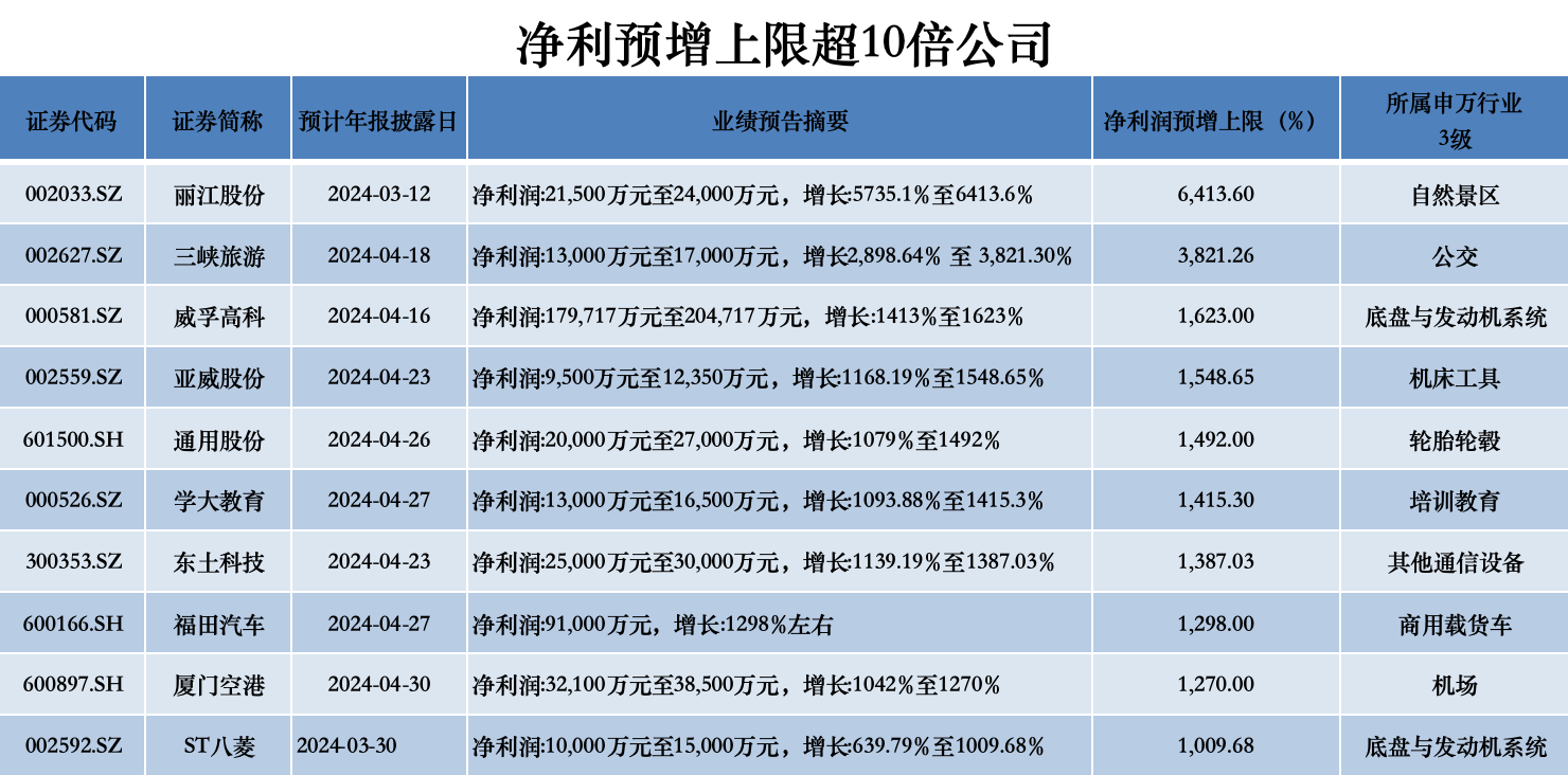 受益于旅游市场的复苏,老牌旅游服务公司丽江股份(002033.SZ)、三峡旅游(002627.SZ)业绩暴增,分别以最高64倍和38倍的净利润同比增幅暂居“年度预增榜”第一、第二。