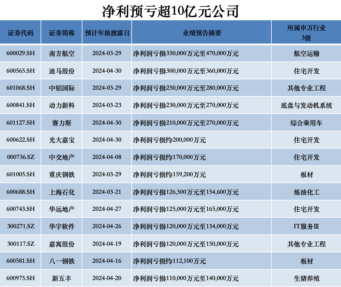 此外,上周还有190家公司发布业绩预亏公告,有14家公司亏损超10亿元,其中,6家公司预计净利润最低亏损金额超20亿元,分别为南方航空、迪马股份(600565.SH)、中铝国际(601068.SH)、动力新科(600841.SH)、赛力斯(601127.SH)、光大嘉宝(600622.SH)。
