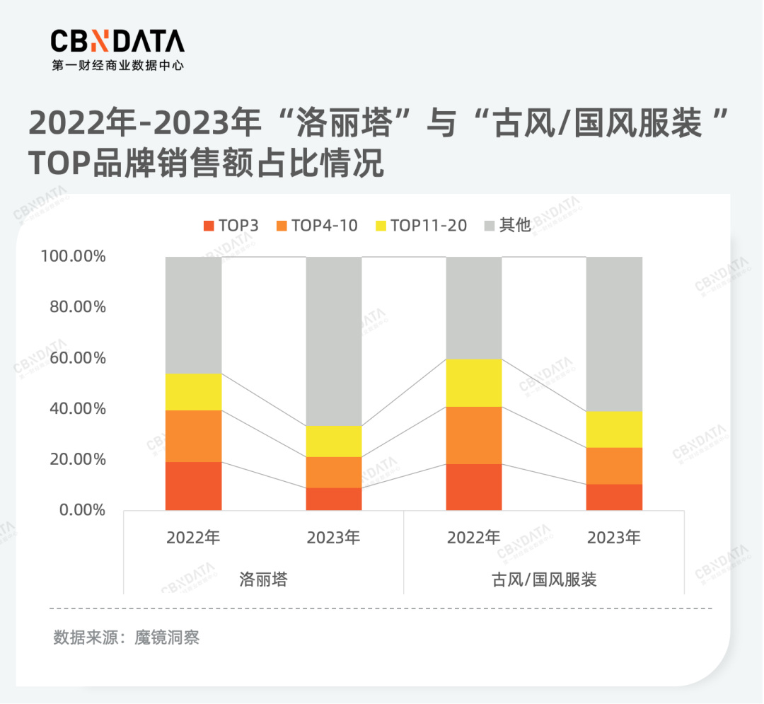 然而喧嚣背后,“洛丽塔”和“古风/古装服装”前20品牌的市场份额均出现了明显下降,头部品牌的市场份额也大幅减少,品牌之间的差距正变得细微。整体来看,两个类目均处于大混战的状态。不同的是,在“洛丽塔”赛道,暂时有三个品牌连续两年稳定处于品类前五之列,这些品牌无一例外地凭借洛丽塔风格的包袋与配饰/道具而名列前茅,这可能为其他萝莉塔相关品牌提供了重要启示。而在“古风/国风服装”领域,品牌间的竞争尤为激烈,最近两年TOP10品牌经历了大规模的更迭,整个赛道呈现出“有品类无品牌”的境况,这期间仅两个品牌能够连续进入排行榜,且两家品牌超过95%的交易额来源于首服类产品。
