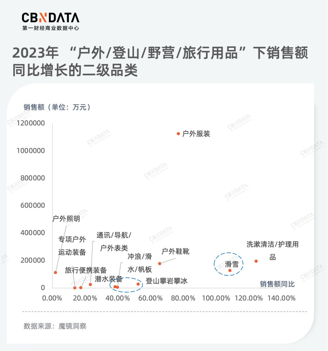 除了户外运动用品外,消费者对运动服装也愈发关注,专业运动服装已外延到大众的日常生活。作为一个具备一定规模的消费品类,运动服装在2023年销售额方面依旧保持涨幅近80%的高增长。
