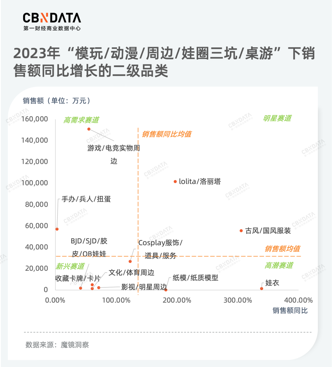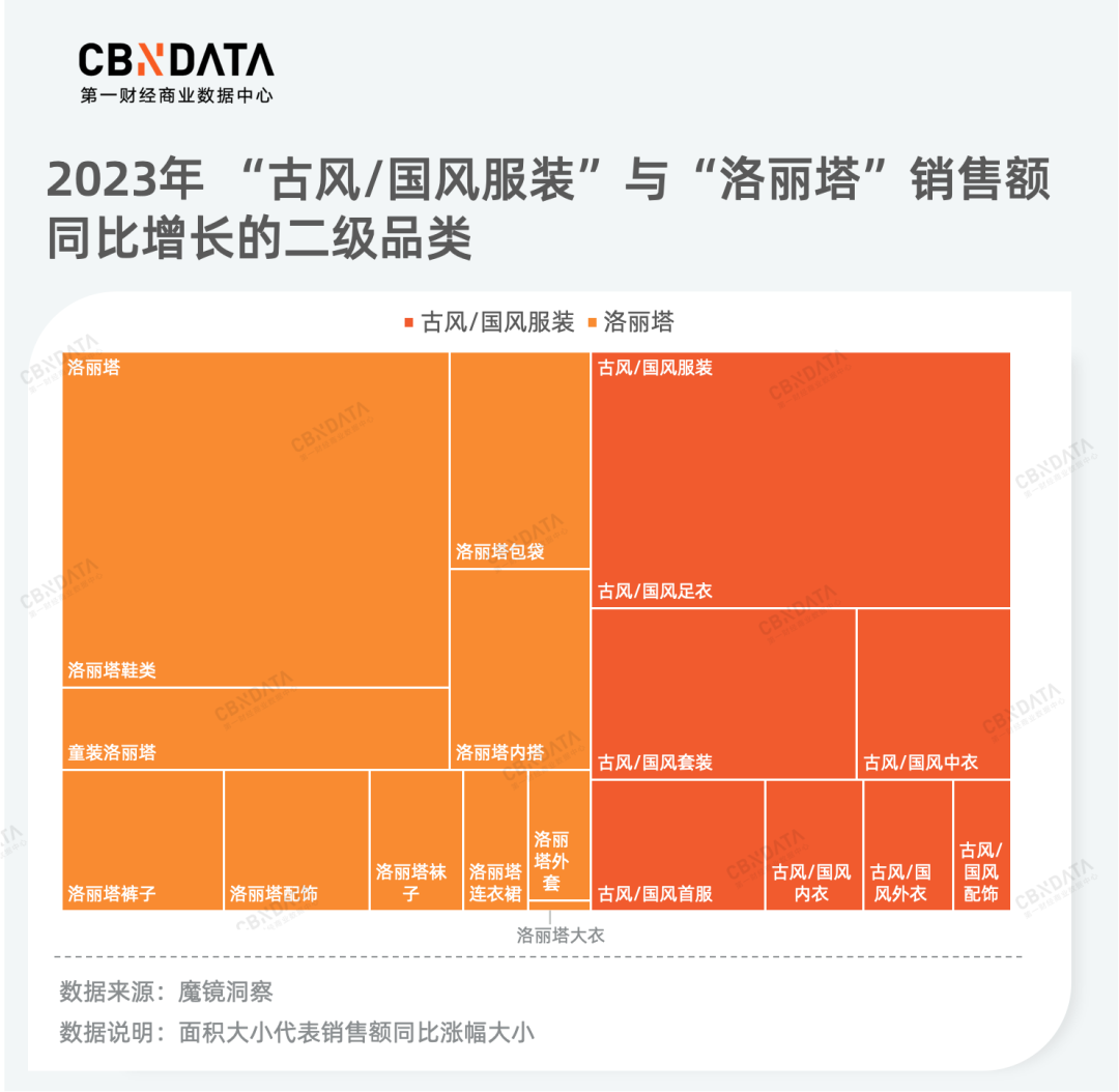 洛丽塔与古风/国风服装作为“模玩/动漫/周边/娃圈三坑/桌游”类别下的两大快速发展赛道,它们发展势头迅猛,并且已经形成一定体量的市场规模。在2023年,这两个领域更是实现了“全面开花”,涵盖了内搭、外套、鞋子、首服(首服泛指汉服中裹首之物,如帽子、头巾等),以及配饰包袋等多个细分品类。