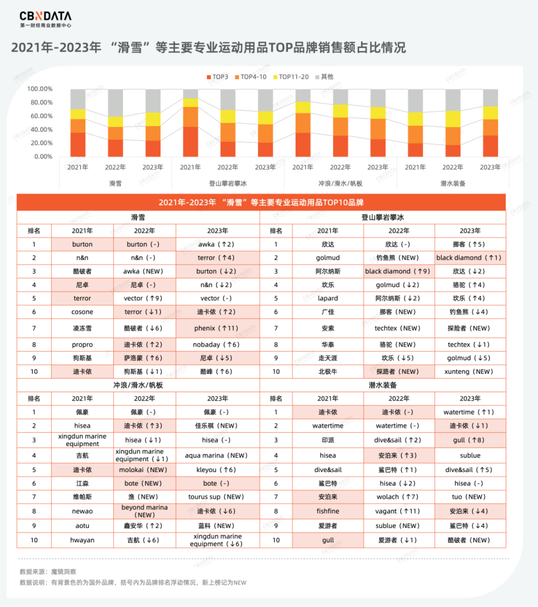 在销售额占比方面,相较于2021年,“滑雪”、“登山攀岩攀冰”、“冲浪/滑水/帆板”三个赛道的集中度更为分散,并且TOP3品牌销售额占比都出现不同程度的下滑,尤其滑雪头部品牌的形势更为严峻,不仅有新玩家不断涌入,还需面临着腰部品牌在身后紧追不舍,2023年TOP10-20品牌的销售额占比达20.2%,同比2021年提升了5.6个百分点。