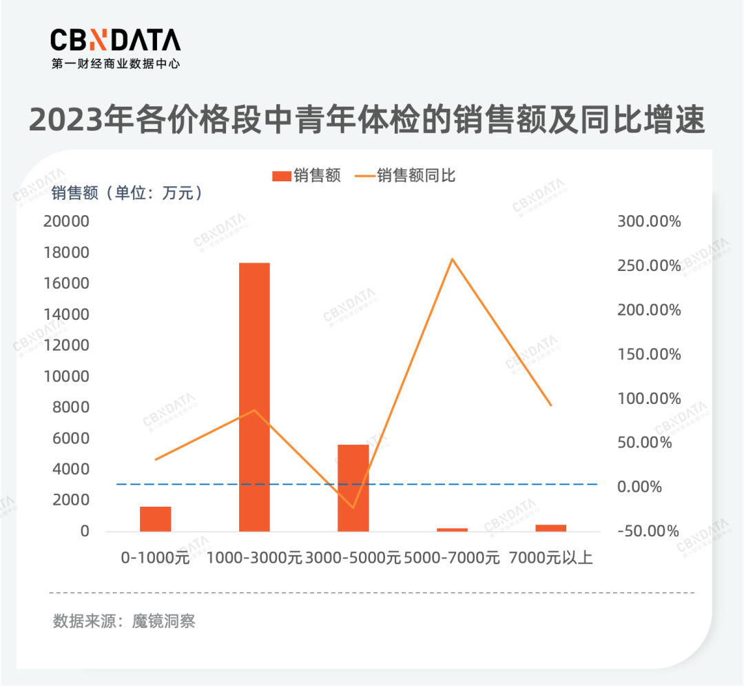 随着健康意识的提升,体检套餐加速向中青年群体下探。2023年中青年体检市场表现亮眼,销售额同比增长39.8%。同时,被外界视为开始“理性消费”的消费者在体检方面投入加大,尤其舍得下“血本”, 5000-7000元及7000元以上的高价产品增长最为迅速。