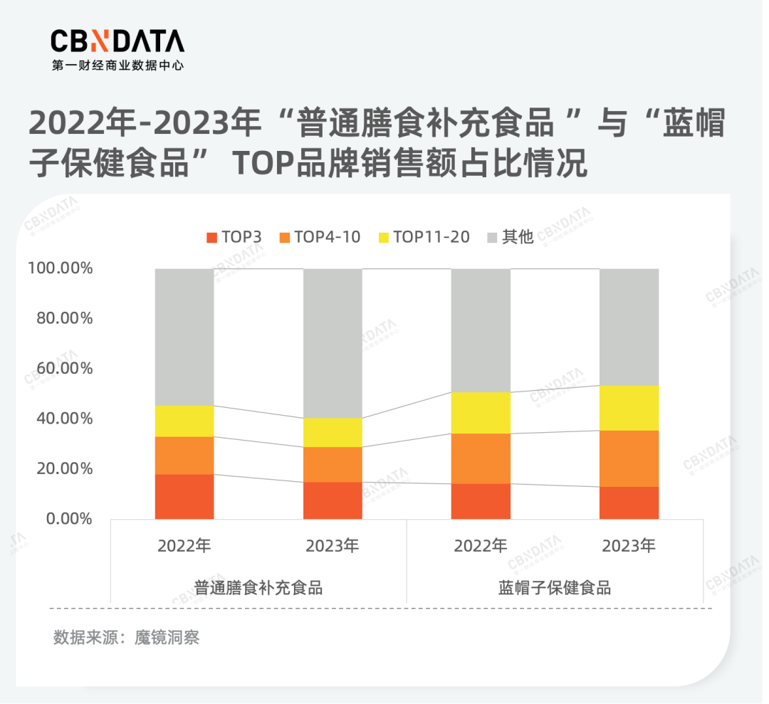 从市场集中度方面来看,这两个品类都处于“群雄逐鹿”的激烈竞争阶段,赛道集中度极其分散。过去两年,TOP20蓝帽子品牌的销售额占比小幅上升,特别是腰部品牌销售额占比大幅扩大。相比之下,TOP20普通膳食食品品牌2023年的销售额占比下降了约五个百分点,头部品牌销售额占比下降幅度最大,面临的市场压力也最为严峻。