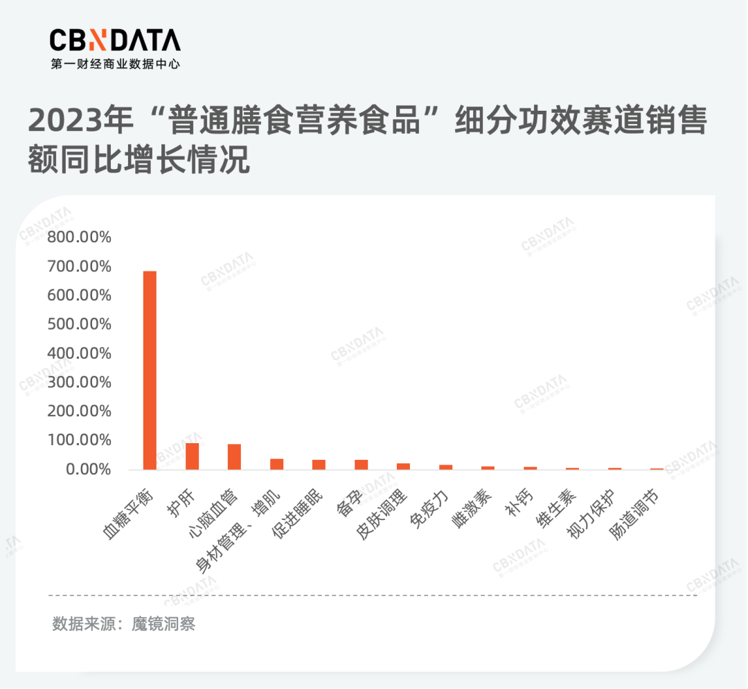 此外,从功效上看,血糖平衡、护肝、心脑血管等普通膳食赛道在2023年表现出极高增长动能,尤其血糖平衡赛道,增长潜力尤为突出。蓝帽子市场的情况与之相似,根据CBNData与天猫健康联合推出的《2024蓝帽子国内保健品消费趋势报告》,心脑血管健康与护肝是蓝帽子市场增速最快的两个赛道。