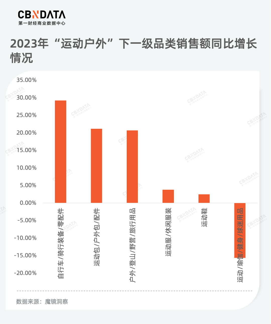 随着运动热源源不断释放红利,相关运动户外用品“水涨船高”。根据魔镜洞察数据,2023年多数运动户外一级品类的销售额实现正向增长,骑行用品的销售额涨幅最为显著。