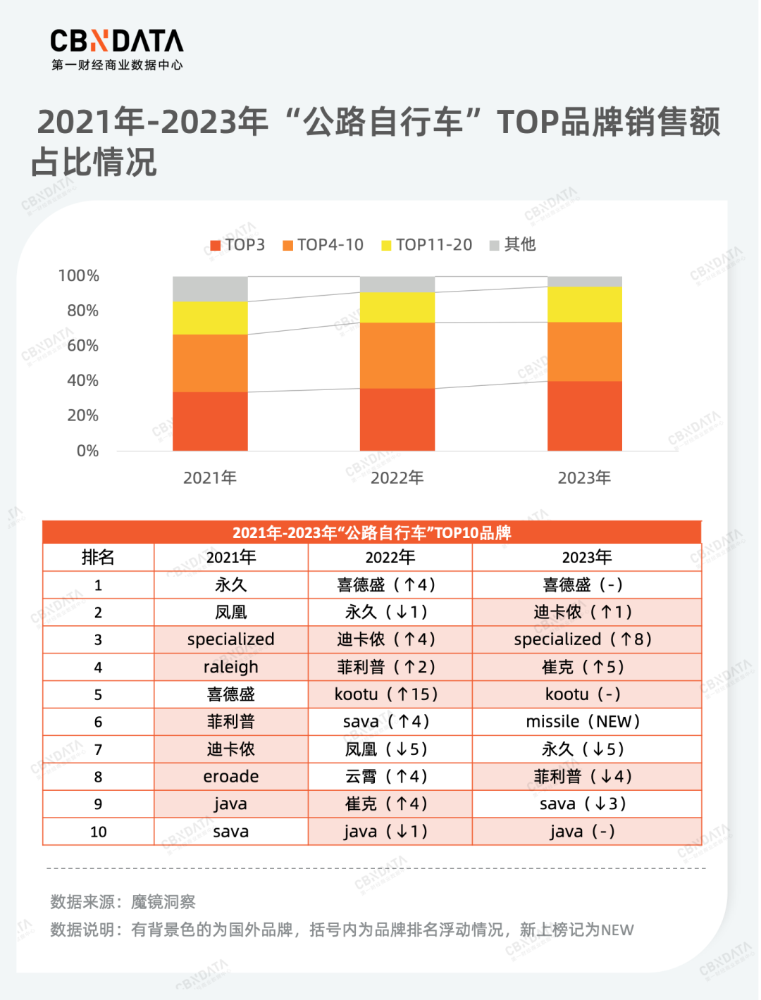 从市场集中度来看,公路自行车前20品牌销售额占比自2022年以来一直保持在90%以上,呈现出高度集中的态势。在销售额TOP10品牌榜单中,美国、意大利等海外品牌在数量和排名上都占据优势,是国产品牌的有力竞争对手。值得一提的是,尽管面临海外品牌的竞争,主打中高端市场的国产品牌喜德盛连续两年位居公路自行车销售额榜首,相较于均价动辄上万的其他品牌,均价在3000多元的喜德盛明显更具性价比。