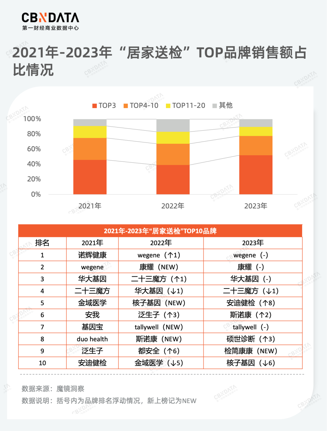 在市场集中度方面,居家送检由于技术壁垒高、资金投入大一直少有玩家入局,所以行业呈现出高度集中的特点,TOP20品牌占据了约90%的市场份额并在这几年小范围浮动。另外,该品类还具有头部效应显著的特点,TOP3品牌的市场份额在三年间逐渐扩大。