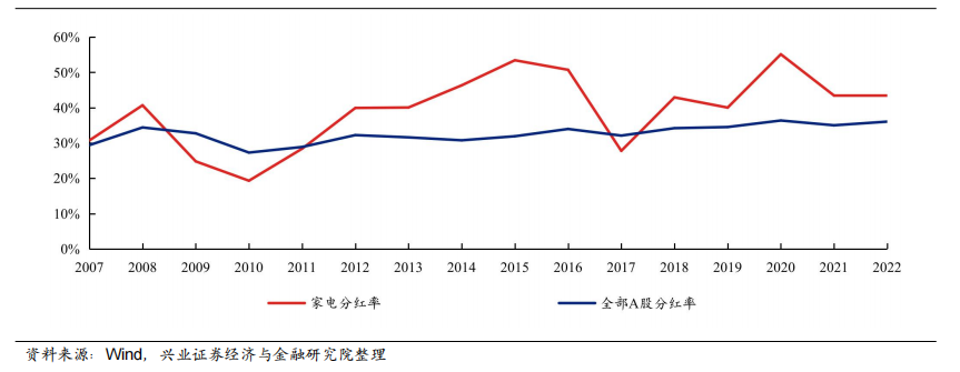 2007-2022 年家电板块与全部 A 股分红率比较(图源兴业证券研报)