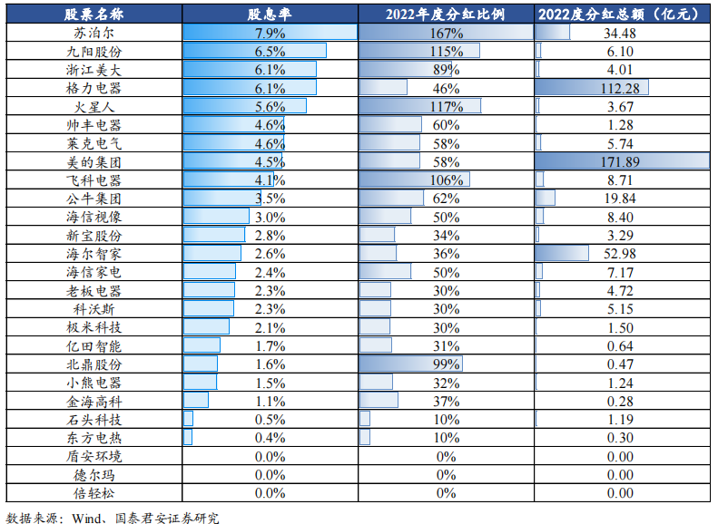 海尔智家上市至今已累计分红296. 87 亿元,平均年分红率32%;海信家电近十年来累计分红约29亿元,其中2022年将分红比例提升至50%。此外,老板电器、九阳股份、小熊电器累计分红已分别达到44.87、79.2、 5.26亿元,多家公司还表示将会持续提升分红比例。