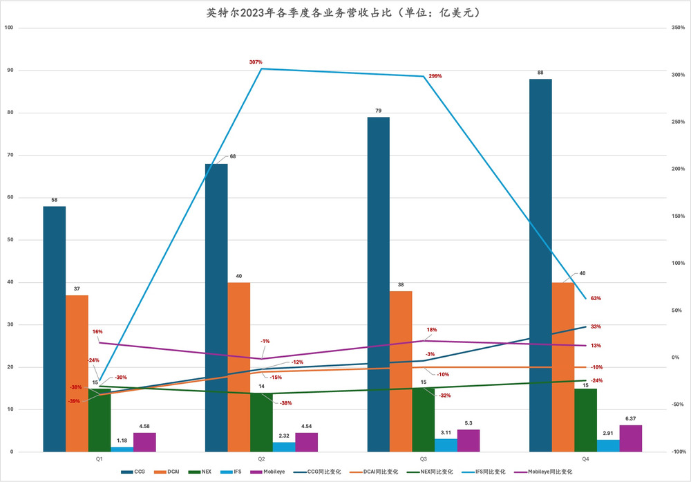 CCG和DCAI分别面向PC处理器市场和数据中心处理器市场。CCG在第四季度实现同比增长33%,前三季度营收分别同比下滑38%、12%、3%,DCAI则从第一季度到第四季度分别同比下滑39%、15%、10%、10%。