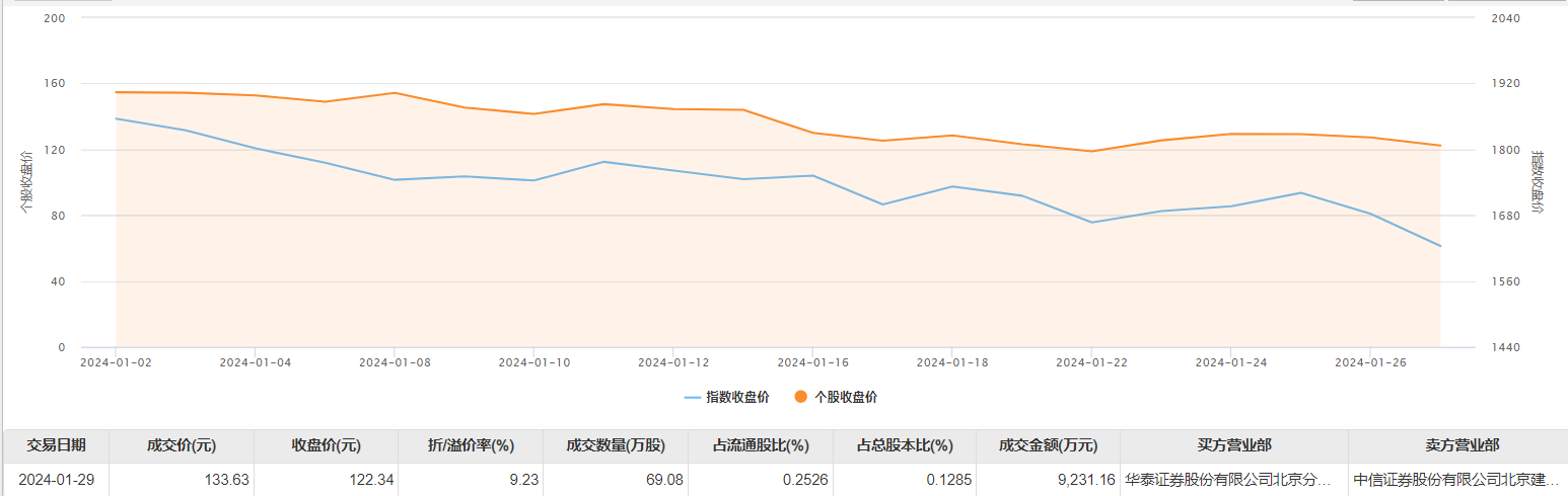 同花顺1月29日大宗交易成交69.08万股,成交额9231.16万元,占当日总成交额的10%,成交价133.63元,较市场收盘价溢价9.23%。