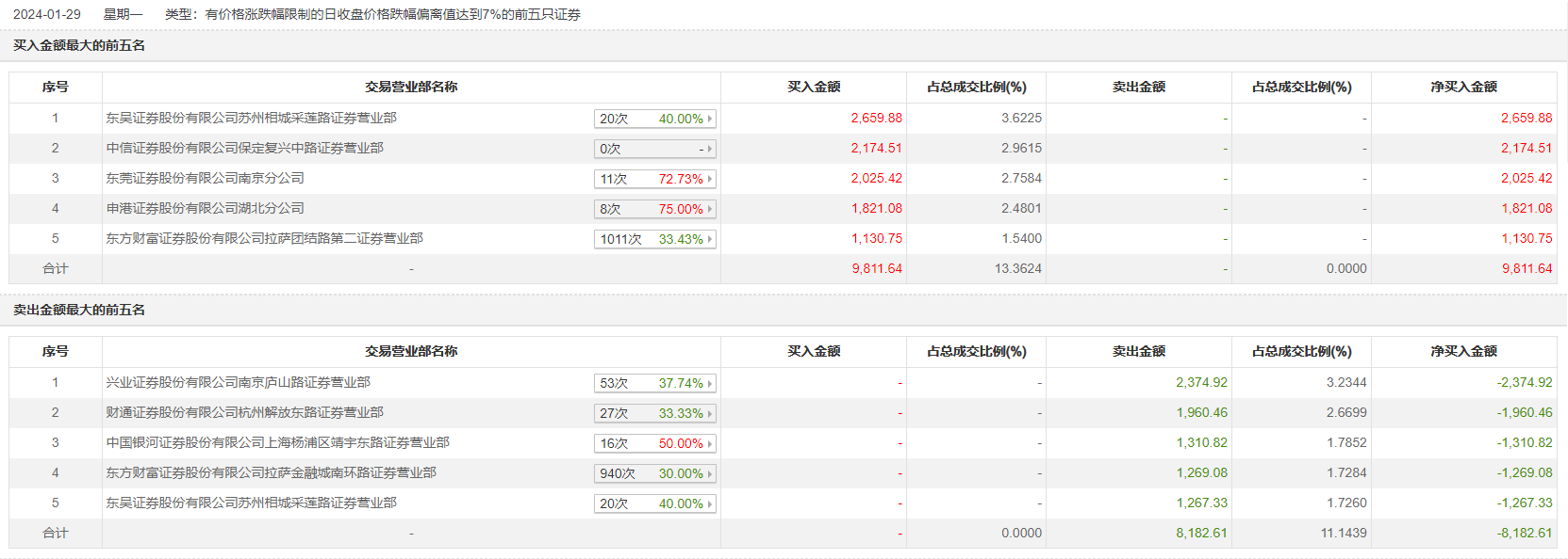 1月29日,上海易连今日跌停,全天换手率达22.99%,振幅达14.2%。龙虎榜数据显示,营业部席位合计净买入1629.03万元。其中,兴业证券南京庐山路证券营业部、财通证券杭州解放东路证券营业部分别卖出2374.92万元、1960.46万元;东吴证券苏州相城采莲路证券营业部、中信证券保定复兴中路证券营业部分别买入2659.88万元、2174.51万元。