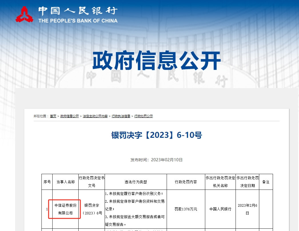 2023年2月,中信证券收到单张1376万元的大额罚单。