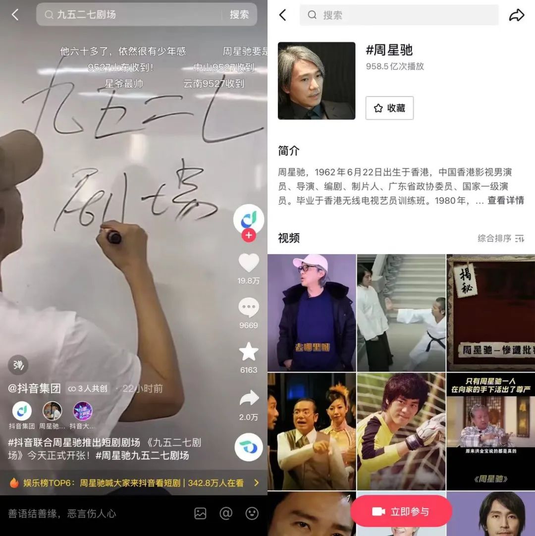 文娱价值官发现,在抖音上,周星驰话题的内容播放量近千亿次,仅次于刘德华,是成龙的两倍之多,足见他在抖音用户中深入人心的程度。周星驰虽然并未以个人身份入驻抖音,但他的作品却一直在这里广为流传。前一段时间,大小杨哥与周星驰的合影也曾被热议一时。在短视频平台“国民巨星争夺战”中,周星驰也是一个重要的砝码。如今,抖音并未选择邀请周星驰入驻、直播,而是拉来他一起做一个短剧厂牌,足见其在精品短剧赛道持续加码的决心。
