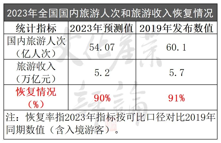 2023年是三年蛰伏后国内旅游业全面复苏之年,跨省游客的大规模流动为各地旅游消费注入活力,旅游人次和旅游收入等关键指标稳步回暖。据文旅部数据中心的最新测算,2023年全国国内旅游人次和旅游收入将达到54.07亿次和5.2万亿元,分别恢复至2019年的90%和91%。