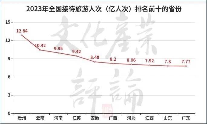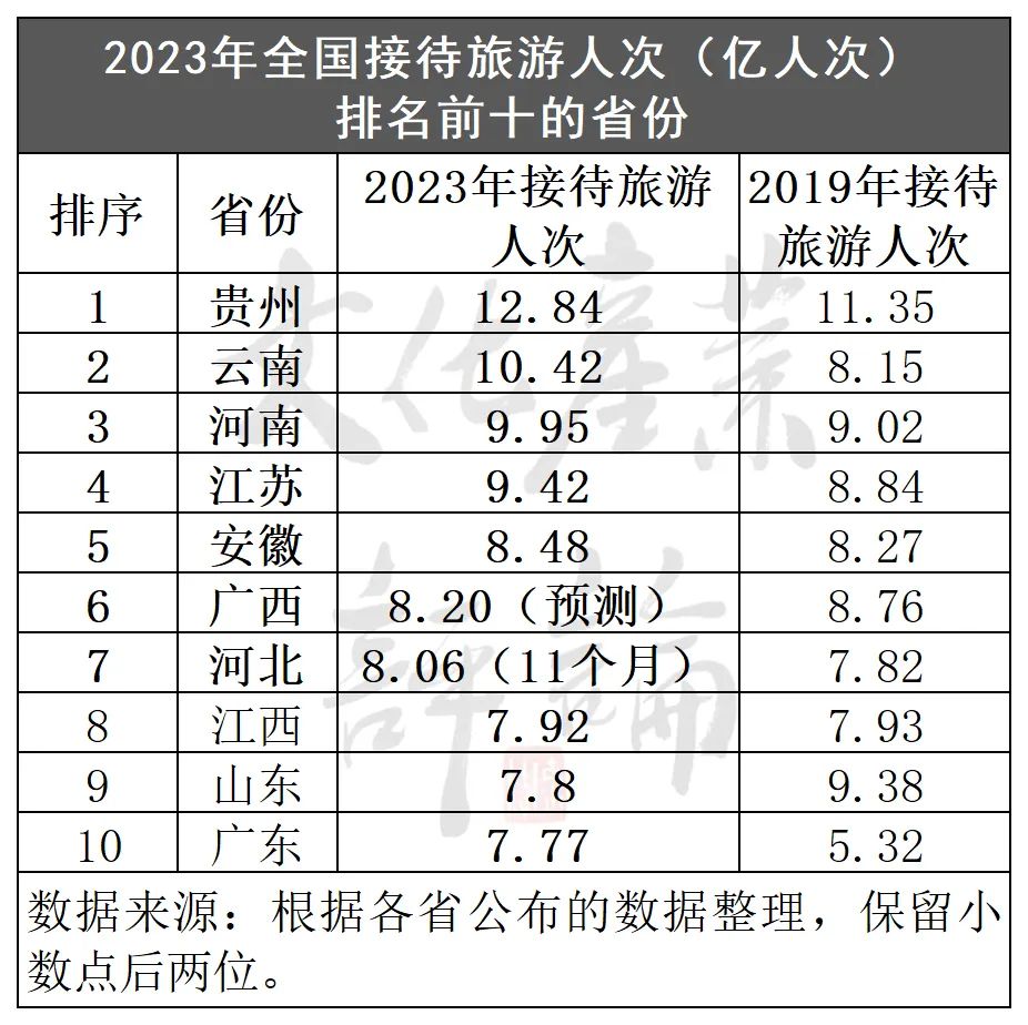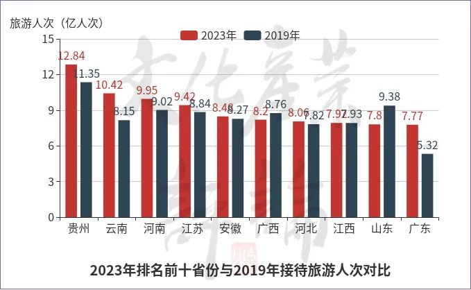 文化产业评论(ID:whcypl)对比2023年与2019年的数据(详见下图),发现在接待旅游人次排名前十的省份中,贵州、云南、河南、安徽、河北、广东等6个省份表现尤为出色,2023年接待游客总人次均超过了2019年同期的水平。