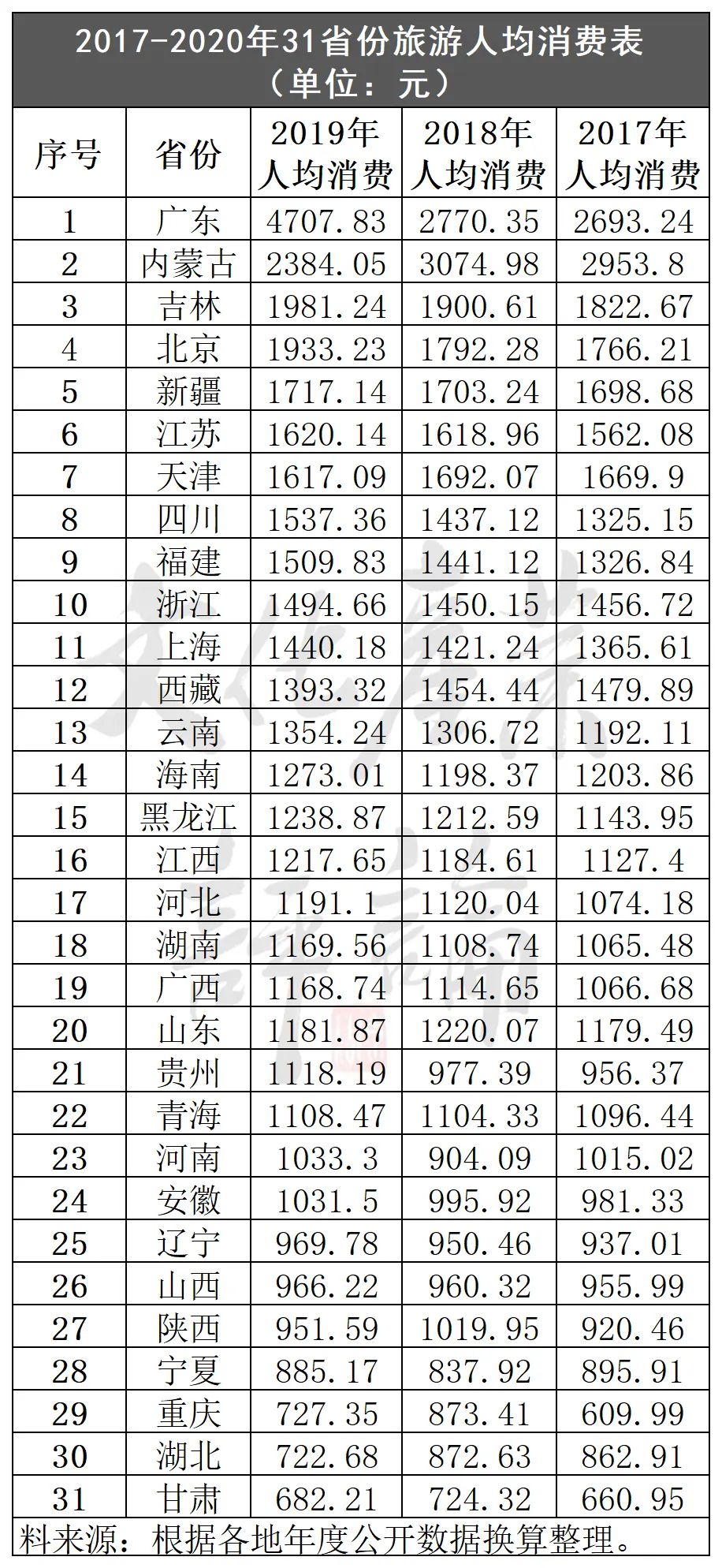 从2019年31个省份人均旅游消费情况看(详见下表),人均旅游消费达到1000元以上的省份共有24个。其中,2000—4000元区间的有2个,分别是广东(4707.83元)和内蒙古(2384.05元);1500—2000元区间的省份有7个;1000—1500元区间的省份有15个;600—1000元区间的省份有7个。按高低取两头,最高是广东省人均4707.83元,最低为甘肃省人均消费682.21元。