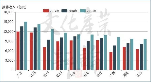 为便于精准对比分析,文化产业评论(ID:whcypl)对疫情前的2017年至2019年旅游收入排名前十的省份进行梳理发现(详见图表):在连续排位前十名成员中,广东、江苏、贵州、四川、浙江、云南、湖南、江西、山东排名较为稳定,总体上下起浮不大。