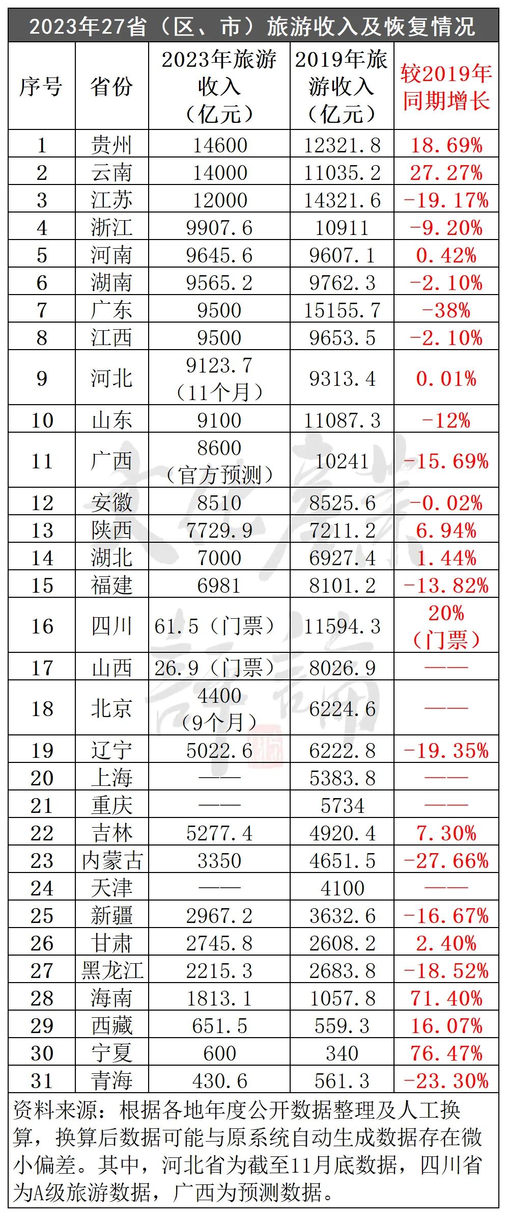 近期,各地两会和文旅局长会议相继召开,据文化产业评论(ID:whcypl)不完全统计,截至目前,已有27个省(区、市)先后公布或披露了2023年度旅游业“成绩单”。数据显示,2023年有多个省份游客总人次或旅游收入反超2019年同期,甚至创下历史新高。历经近3年行业洗牌,竞争局势有何变化?