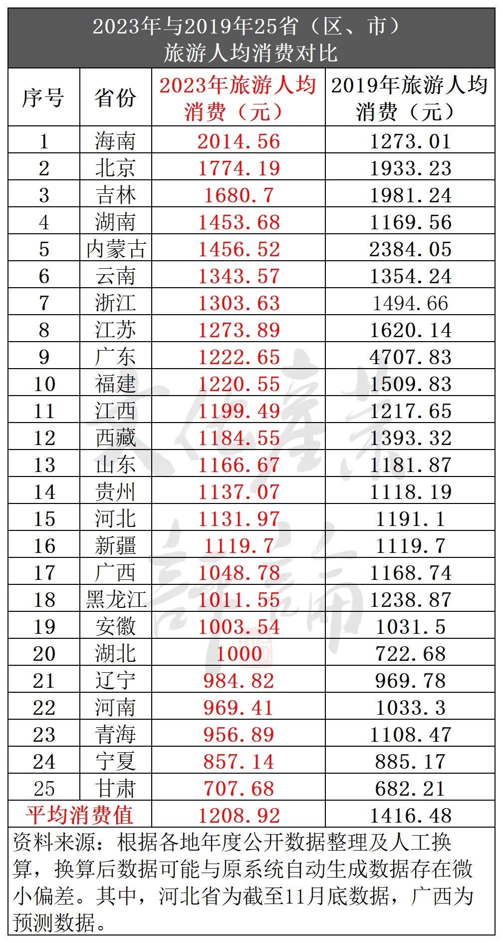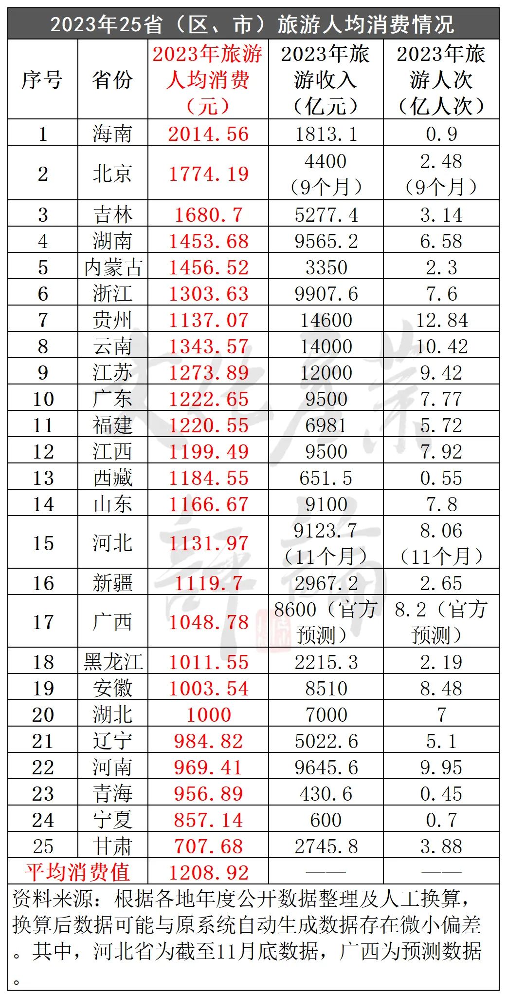 2020年初疫情发生后,国内旅游人均消费金额开始出现大幅下降,2021年有所增长回温,2022年又小幅下滑,综合平均值基本保持在800—1000元区间。据文化产业评论(ID:whcypl)梳理发现,在已公布2023年相关数据的27个省份中,具备全省旅游人次及旅游收入等完整数据链的省份有25个,综合旅游人均消费值大约在1208.92元区间,出现一定的回升趋势(因31个省数据不全无法得出较为精准数据,与实际数据可能存在落差点)。