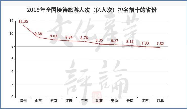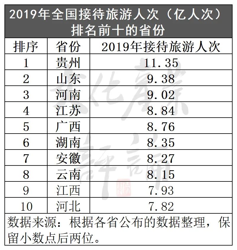 文化产业评论(ID:whcypl)在深入分析了31个省(区、市)2019年的旅游数据后发现,疫前接待旅游人次排在前十的省份分别是贵州、山东、河南、江苏、广西、湖南、安徽、云南、江西和河北,前八个省份的旅游接待人次均突破了8亿大关(详见图表)。
