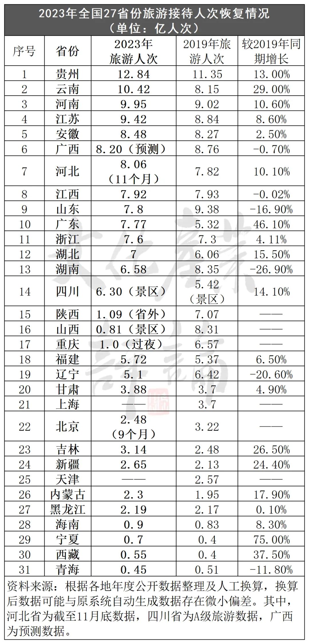 旅游人次:七省超8亿、两省超10亿