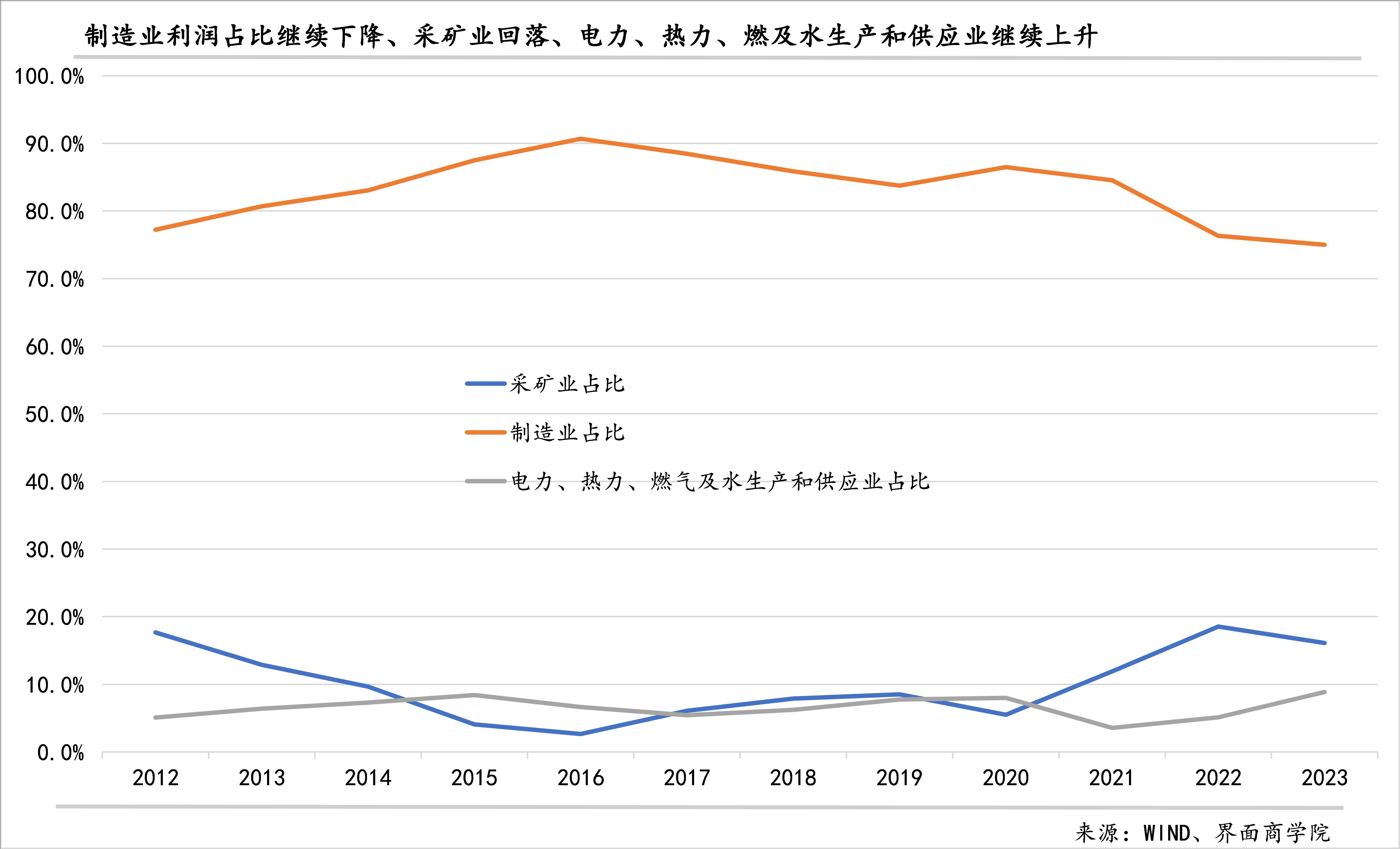 从三大行业来看,占比最大的制造业最让人忧心,其营业收入利润率连续第二年下降至5%,为2017年发布以来最低,较2022年下降0.35个百分点;制造业利润总额增速同比继续下降,降幅较上年收敛至2%;其在工业利润中的占比降至75%,为2012年发布以来新低。
