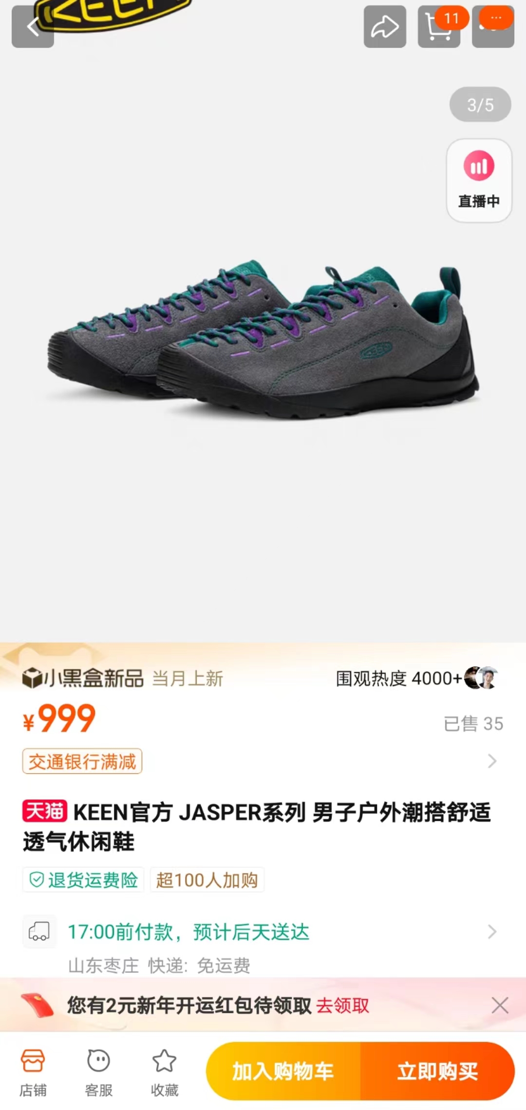 界面新闻记者以消费者的身份在小红书上联系了多位日本代购,以Keen在天猫旗舰店定价999元的灰色款Jasper鞋款为例,其代购价格在550元至700元不等,算上邮费也不会超过750元,与国内官方渠道购买的差价在200元以上。
