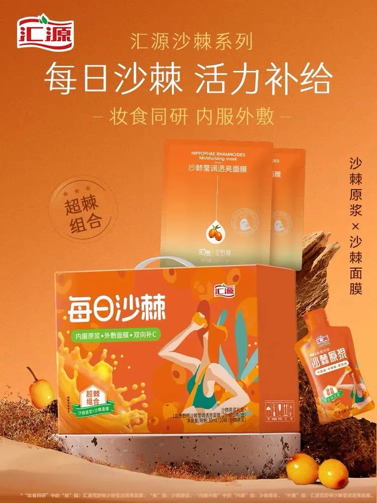 汇源用一款面膜杀入了美妆日化领域。前阵子,汇源推出“每日沙棘礼盒”,礼盒包括10袋沙棘原浆果汁和5片“沙棘莹润透亮面膜”,售价79元起。若单买面膜,价格为69.5元/5片。