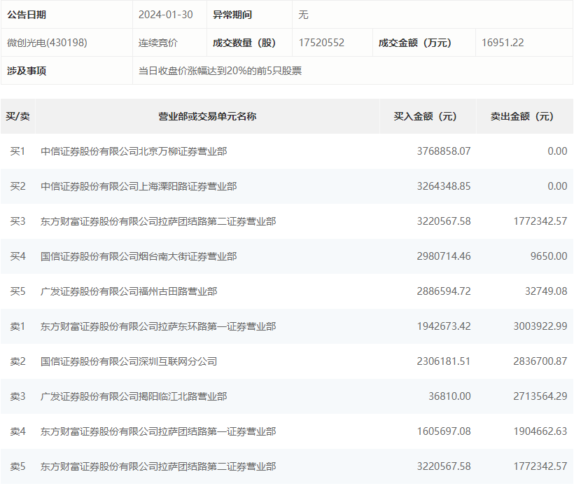 1月30日,微创光电今日涨停,龙虎榜数据显示,上榜营业部席位全天成交3428.6万元,占当日总成交金额比例为20.23%。其中,买入金额为2201.24万元,卖出金额为1227.36万元,合计净买入973.89万元。