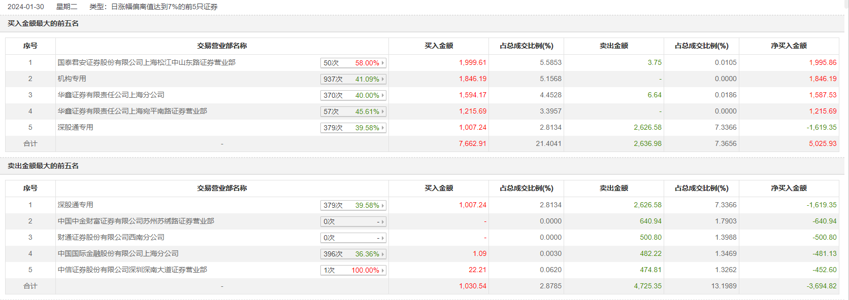 1月30日,浙江世宝今日涨停,龙虎榜数据显示,上榜营业部席位全天成交1.24亿元,占当日总成交金额比例为34.7%。其中,买入金额为7686.21万元,卖出金额为4735.75万元,合计净买入2950.46万元。