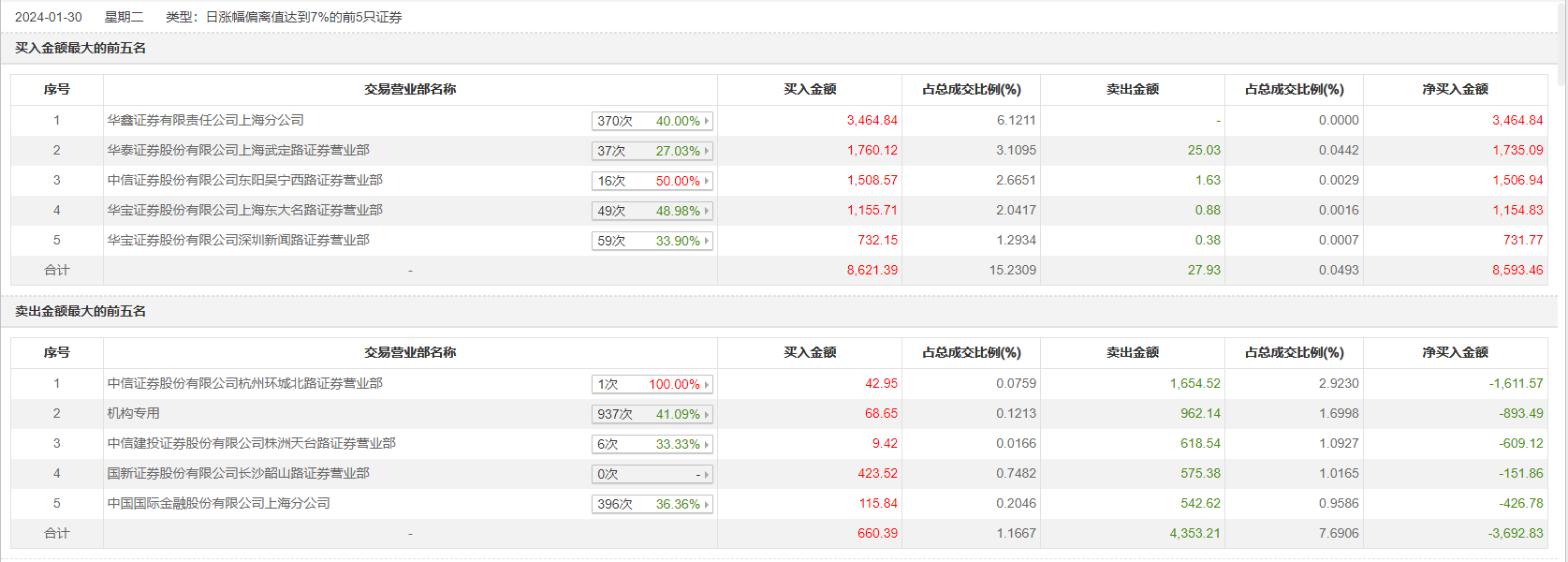 1月30日,天桥起重今日涨停,全天换手率达12.36%,振幅达14.05%。龙虎榜数据显示,营业部席位合计净买入4900.63万元。其中,机构买入68.65万元,卖出962.14万元,合计净卖出893.49万元。此外,华鑫证券上海分公司、华泰证券上海武定路证券营业部分别买入3464.84万元、1760.12万元;中信证券杭州环城北路证券营业部、中信建投证券株洲天台路证券营业部分别卖出1654.52万元、618.54万元。