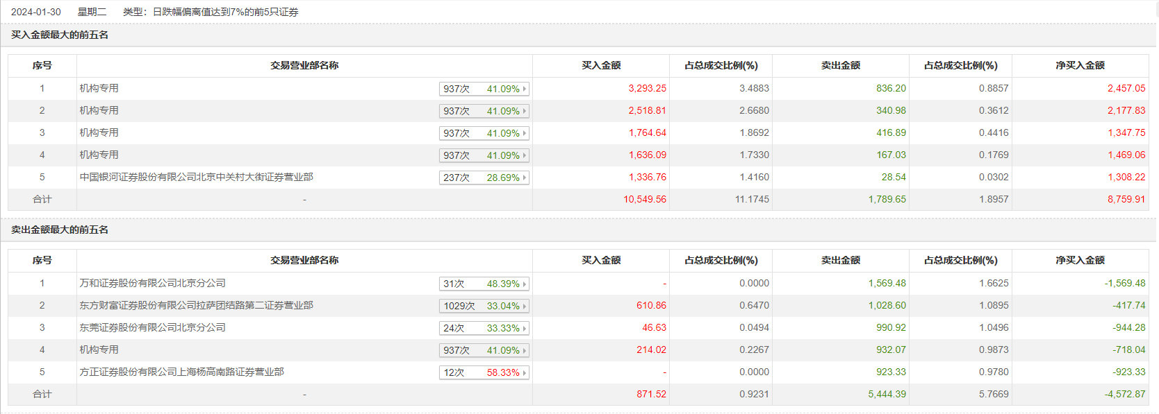 1月30日,中成股份今日跌停,龙虎榜数据显示,上榜营业部席位全天成交1.87亿元,占当日总成交金额比例为19.76%。其中,买入金额为1.14亿元,卖出金额为7234.04万元,合计净买入4187.03万元。