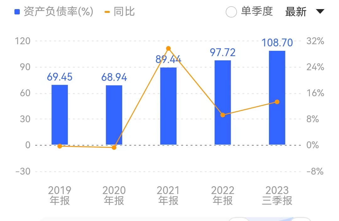 不仅如此,人人乐的财务状况也面临进一步恶化。截至2023年三季度末,人人乐的资产负债率由2022年的97.72%进一步攀升至108.70%,已处于资不抵债的境地。