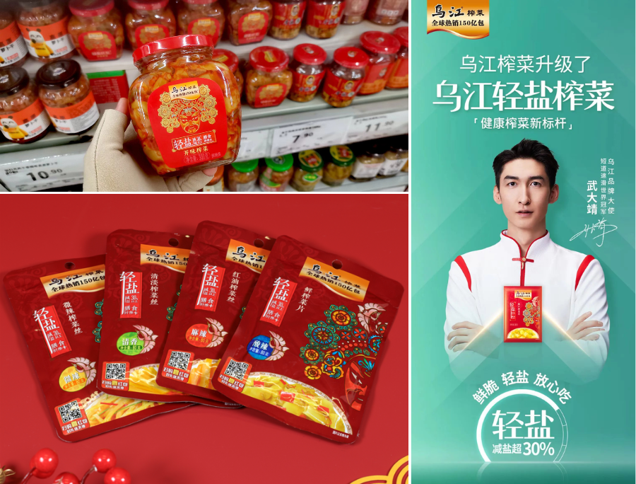 作为符合现代人低盐饮食需求的“升级版榨菜”,“轻盐”系列宣传减盐量达到30%,含有15种氨基酸和膳食纤维,全新包装继续延用传统国潮元素“川剧变脸”的设计,只是文案更加凸显“鲜脆、轻盐、放心吃”。同时在营销推广中,选择了知名运动员、短道速滑世界冠军武大靖作为品牌形象大使,营造出健康饮食的倾向。